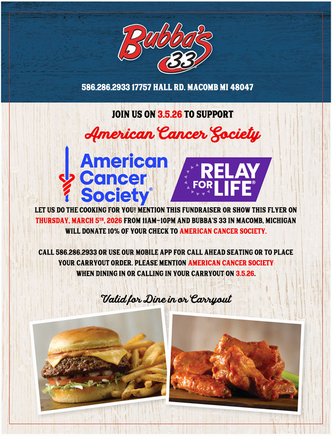 This year’s Relay Kick Off and Fundraiser will be held Thursday March 5 from 11 am to 10 pm at Bubba’s 33 on Hall Road in Macomb, MI. Mention the American Cancer Society when dining in or when calling in your carry out order and 10% of your check will be donated to Relay For Life of Greater Shelby Township. See flyer here for more details: Bubba’s Dine and Donate Flyer